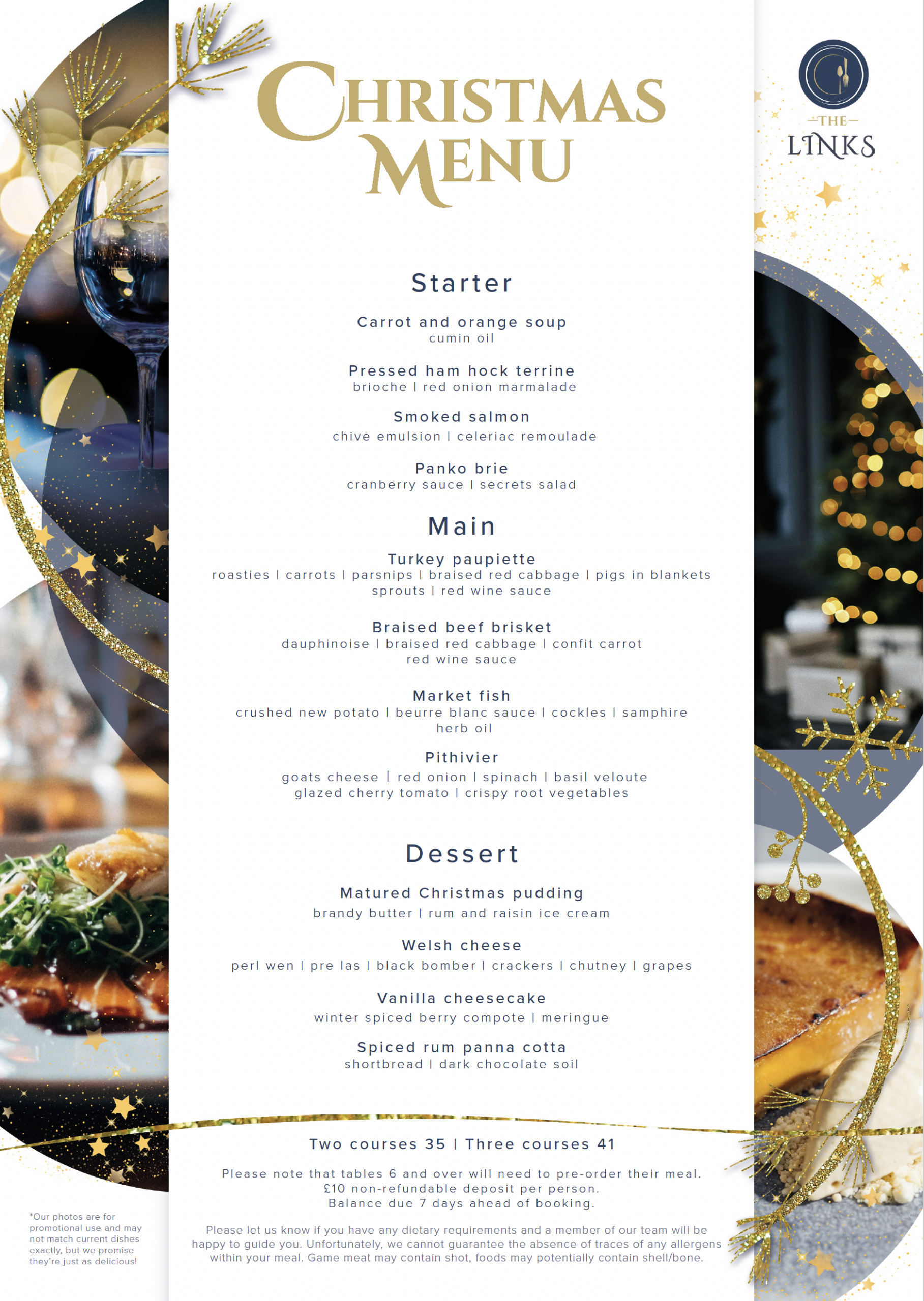 Enjoy a relaxed yet lively evening in The Links, beginning with a welcome glass of Prosecco, followed by a delicious three-course Christmas meal. As the evening continues, our DJ will provide the soundtrack for dancing and socialising into the night.